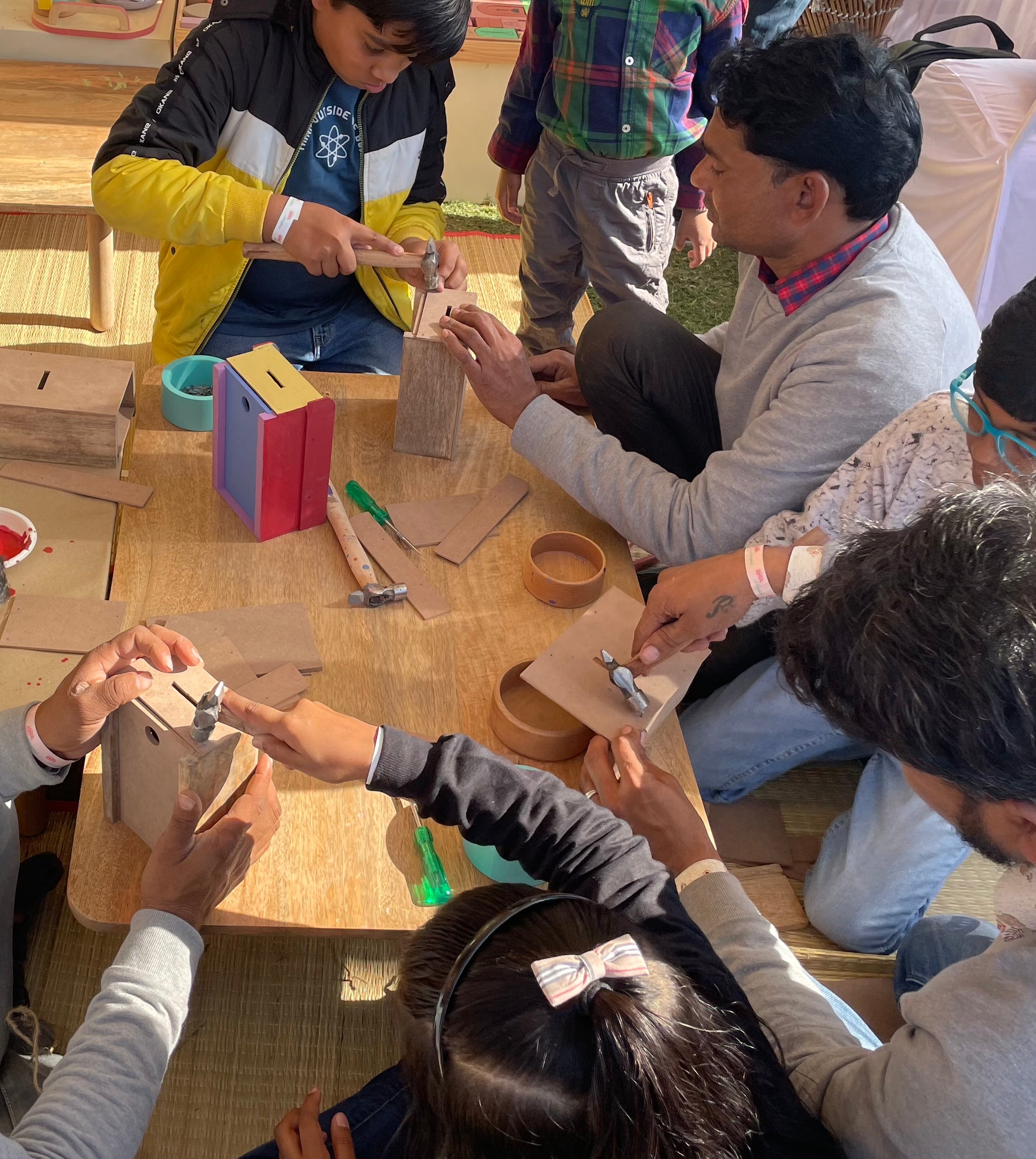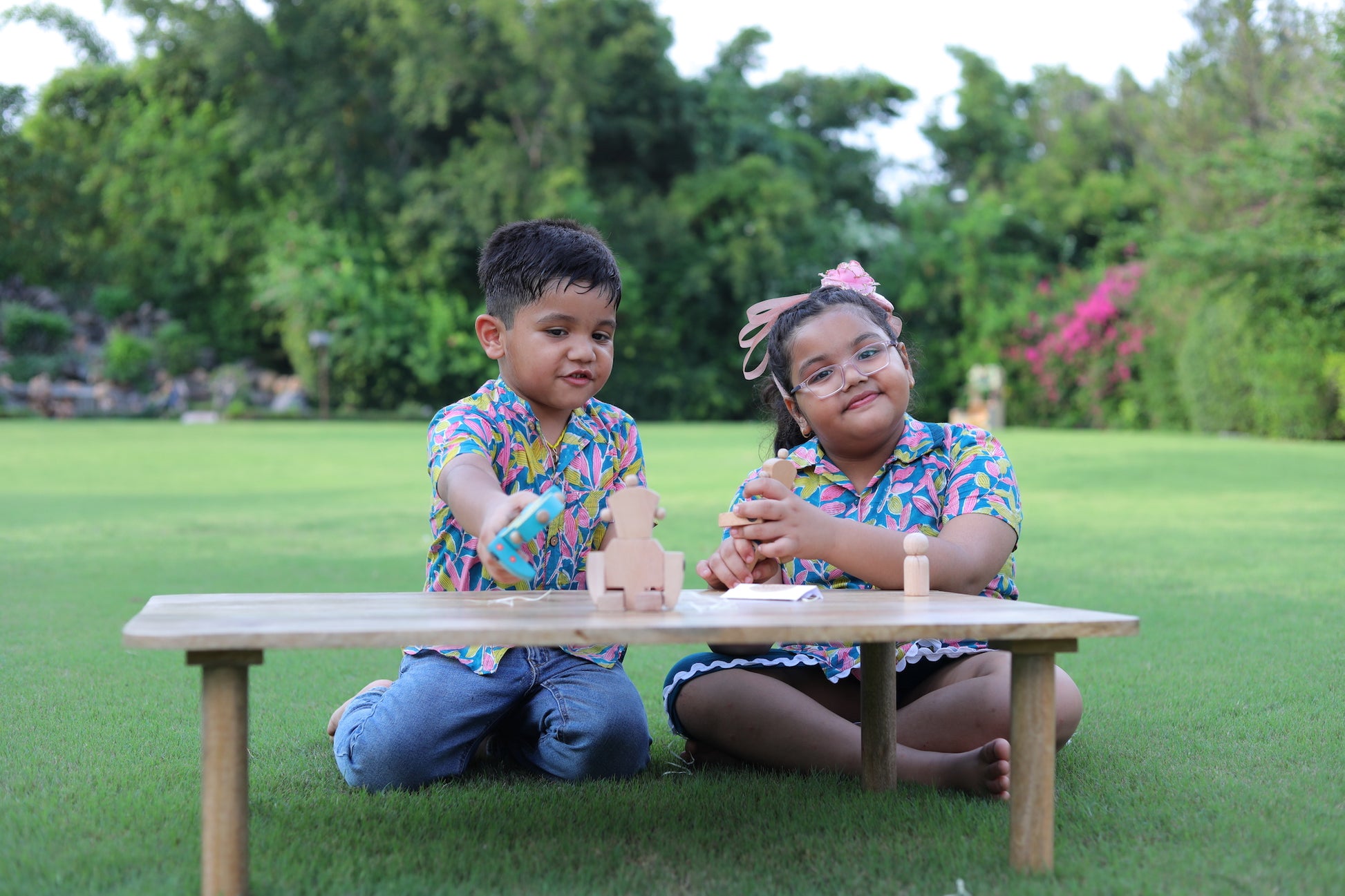 This wooden chowki (low table) is thoughtfully designed for children to work while sitting or kneeling on the floor—supporting independence, flexibility, and grounded engagement.