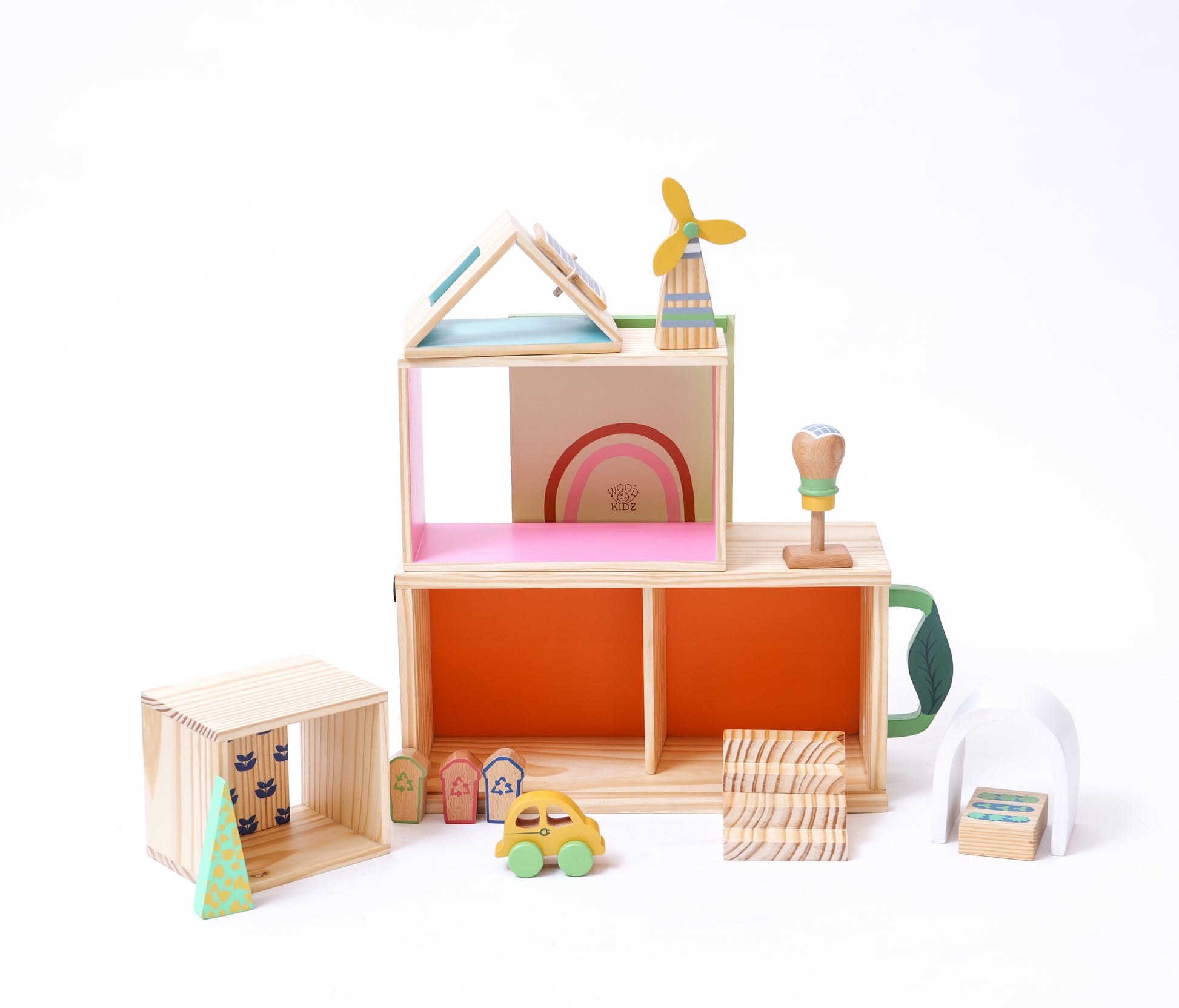 Introduce your child to the world of sustainability with My Eco Home by Wood-O-Kidz—a travel-friendly wooden play set designed to nurture environmental awareness through hands-on, imaginative play. This thoughtfully crafted toy teaches children how to live in harmony with nature, encouraging small, meaningful actions like saving energy, recycling, and using renewable resources like solar and wind power.